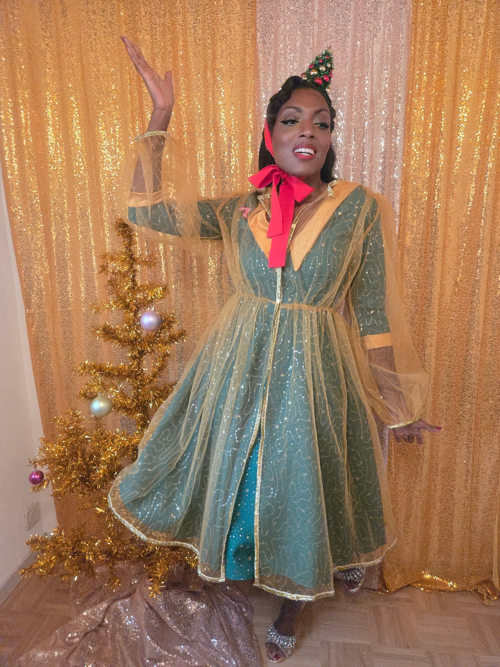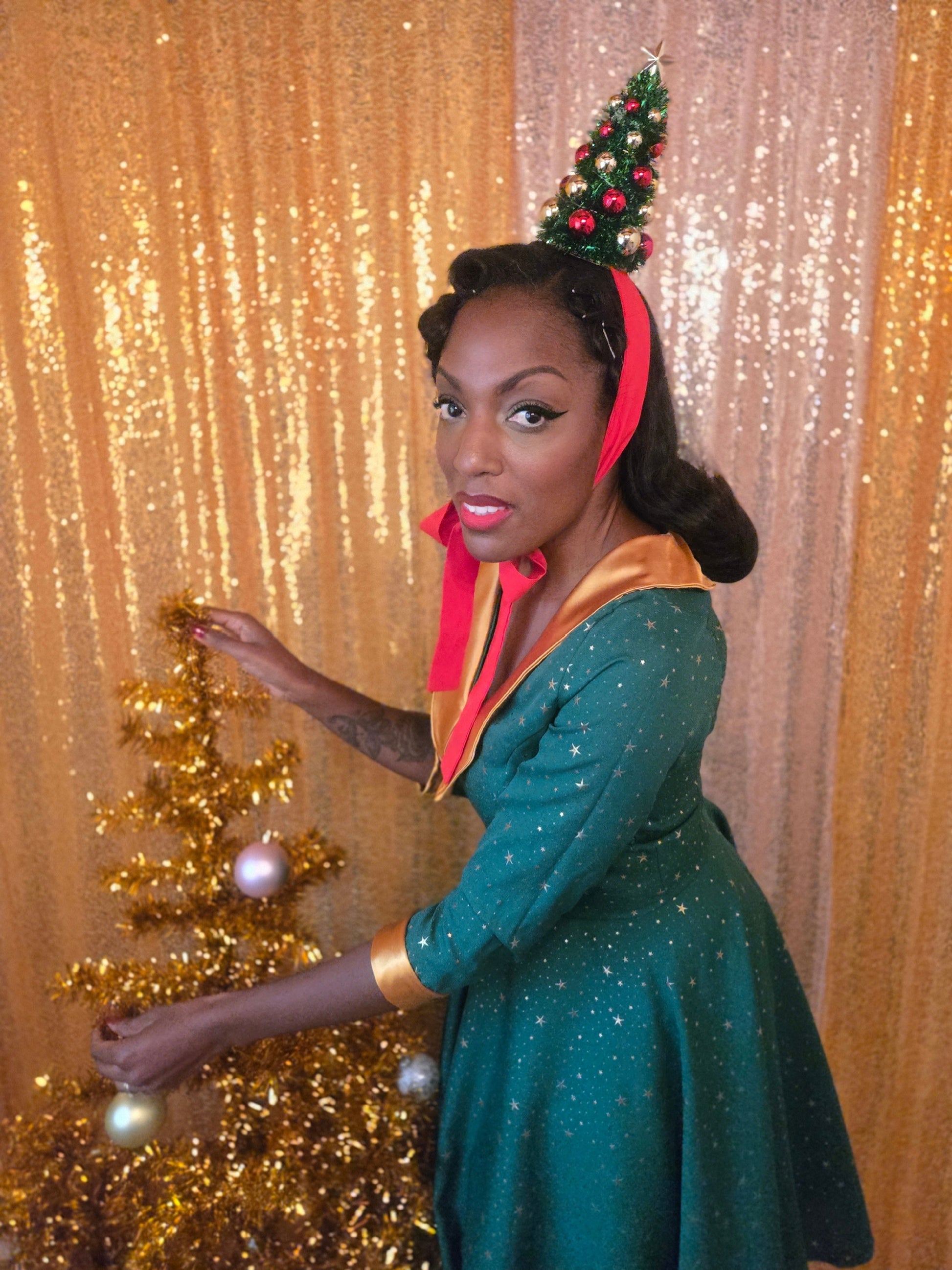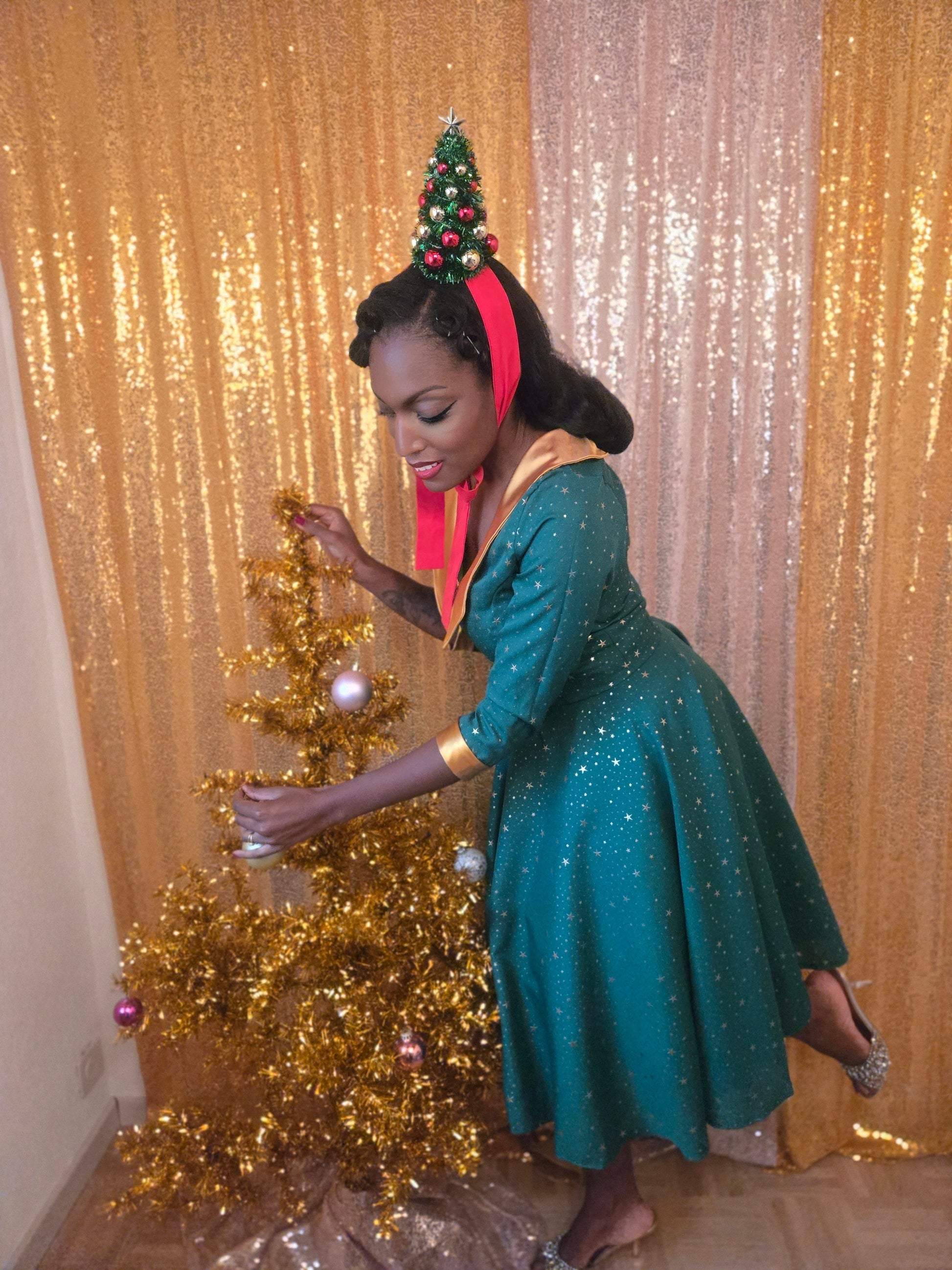 ÉDITION TRÈS LIMITÉE EN PRÉCOMMANDE jusqu'au 15 novembre 2025🎄Soyez la star de votre repas de Noël entre ami(e)s, collègues ou en famille avec notre robe de fêtes STELLA ! Sa coupe largement inspirée des silhouettes classiques des années 50, elle allie glamour, élégance et confort avec son tissu épais vert orné de petites étoiles dorées. Le col et les manches sont, quant à eux, rehaussés d'un liseret or pour la touche festive. Fêtez Noël avec style et faites sensation avec notre robe de Noël STELLA ✨️